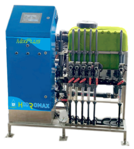 Estrutura em aço inoxidável que incorpora a bomba auxiliar (50 ou 60 Hz), o tanque de mistura de 100 l, os sensores de pH e EC, o painel elétrico, um dispositivo de segurança para bloquear a injeção de fertilizantes e o equipamento de controlo Mithra Hidro.
