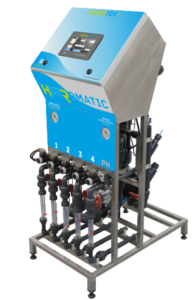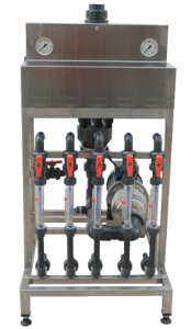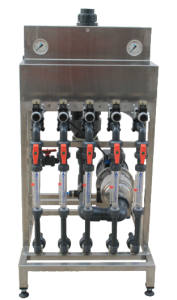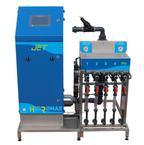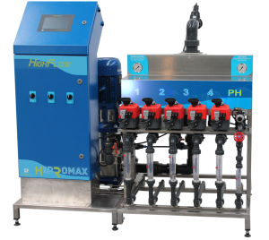 Estrutura em aço inoxidável que incorpora a bomba auxiliar (50 ou 60 Hz), os sensores de pH e CE, o painel elétrico e o equipamento de controlo Hidrotek.